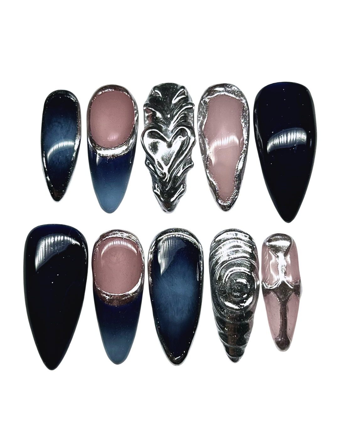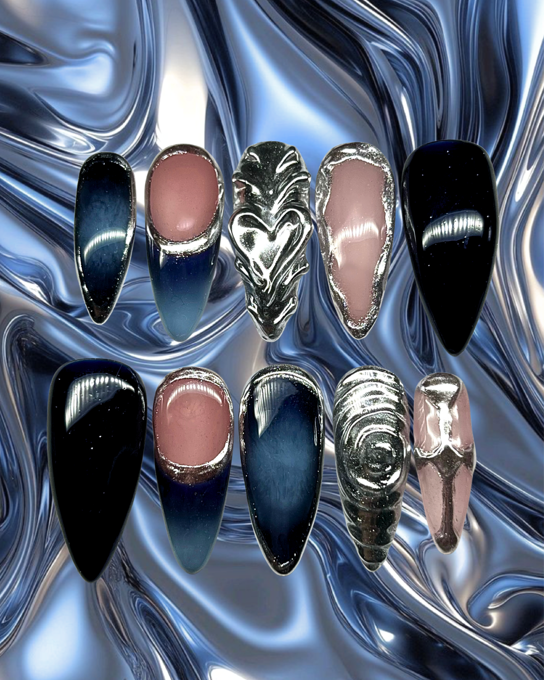 Elements: Deep blue galaxy nails, silver chrome designs, french tips