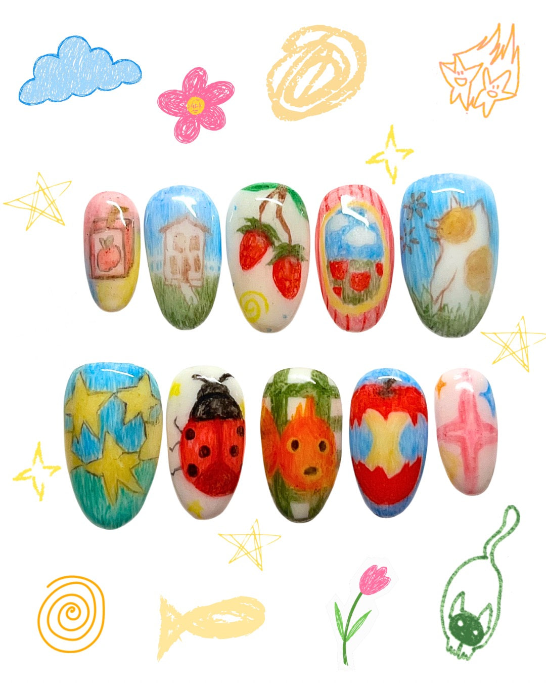 Materials: Gel X Apres tips, Korean gel polishes, colored pencil art
