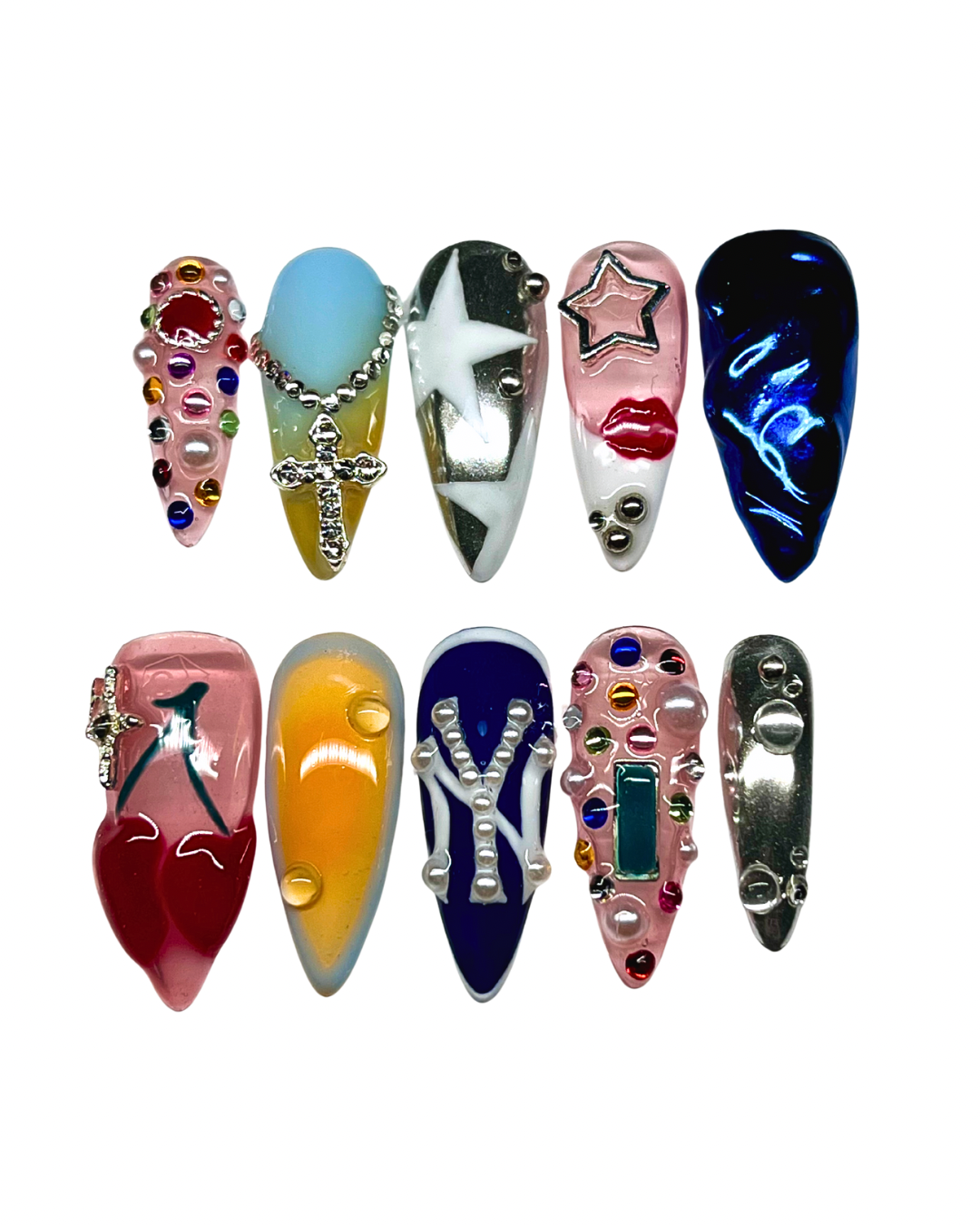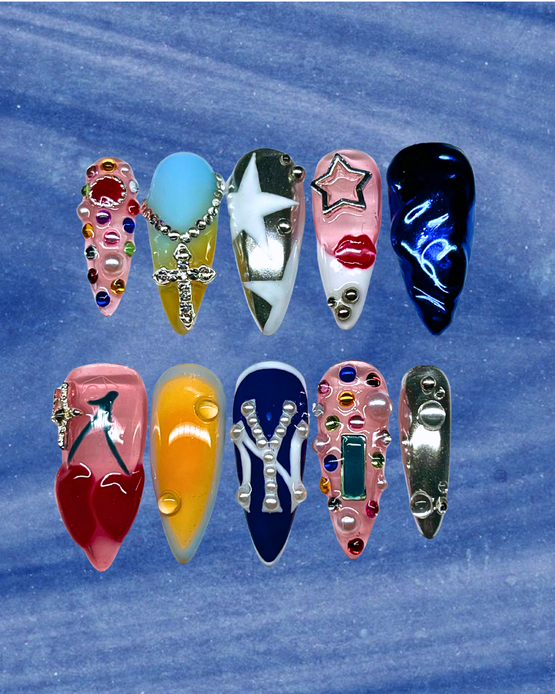 Elements: Silver charms, 3D elements, handpainted designs, rhinestones, multicolored nails, silver chrome, deep blue chrome